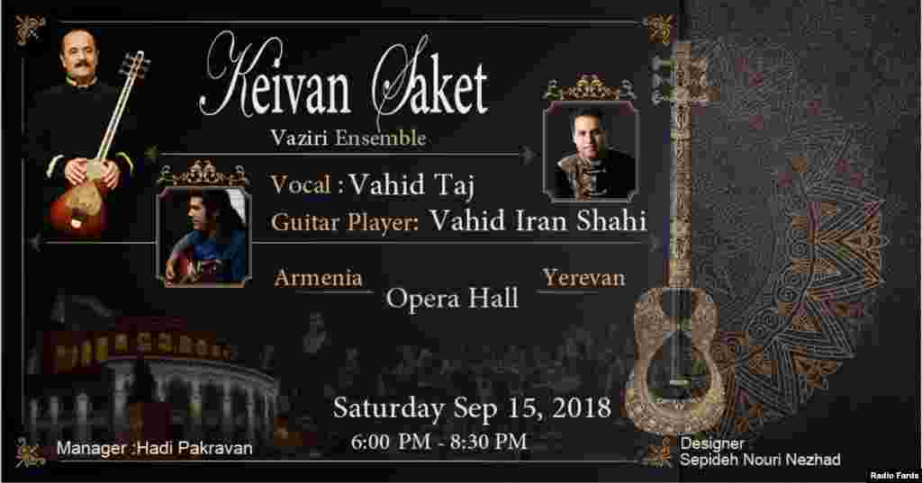 کیوان ساکت، هنرمند سرشناس ایران و گروه موسیقی وزیری، شنبهشب ۲۴ شهریور در شهر ایروان در ارمنستان به روی صحنه رفتند. این گزارش تصویری گوشههایی از همین کنسرت را بازتاب میدهد.