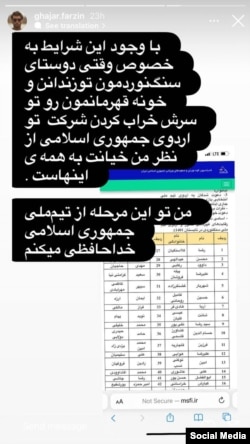 وی در یک استوری نوشته وقتی «دوستای سنگنوردمون تو زندانن و خونه قهرمانمون رو تو سرش خراب کردن، شرکت تو اردوی جمهوری اسلامی از نظر من خیانت به همه اینهاست».