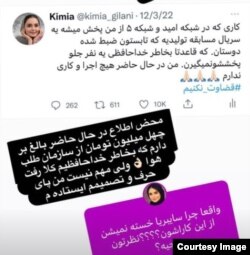 کیمیا گیلانی همچنین در اینستاگرام خود پوششدادن این دروغ را «کار سایبریها» توصیف و تأکید کرده است که علیرغم «طلب چهل میلیون تومانی» از صداوسیما که بهخاطر کنارهگیری از این سازمان «کلاً رفت هوا»، پای حرف و تصمیمش ایستاده است.