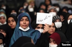 خبرگزاری تسنیم عکسی از جلسه تازه دانشجویان با علی خامنهای منتشر کرده که یک دانشجو شعار اصلی اعتراضات مردمی در ایران را به «زن، زندگی، شهادت» تغییر داده است:
