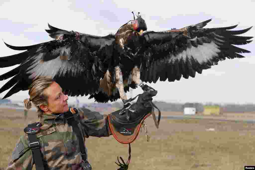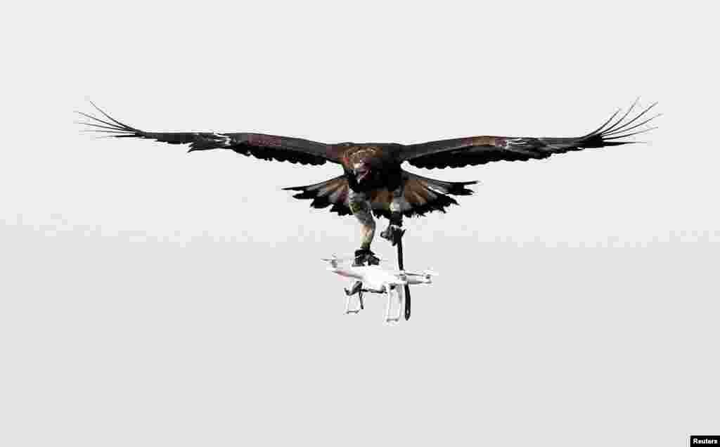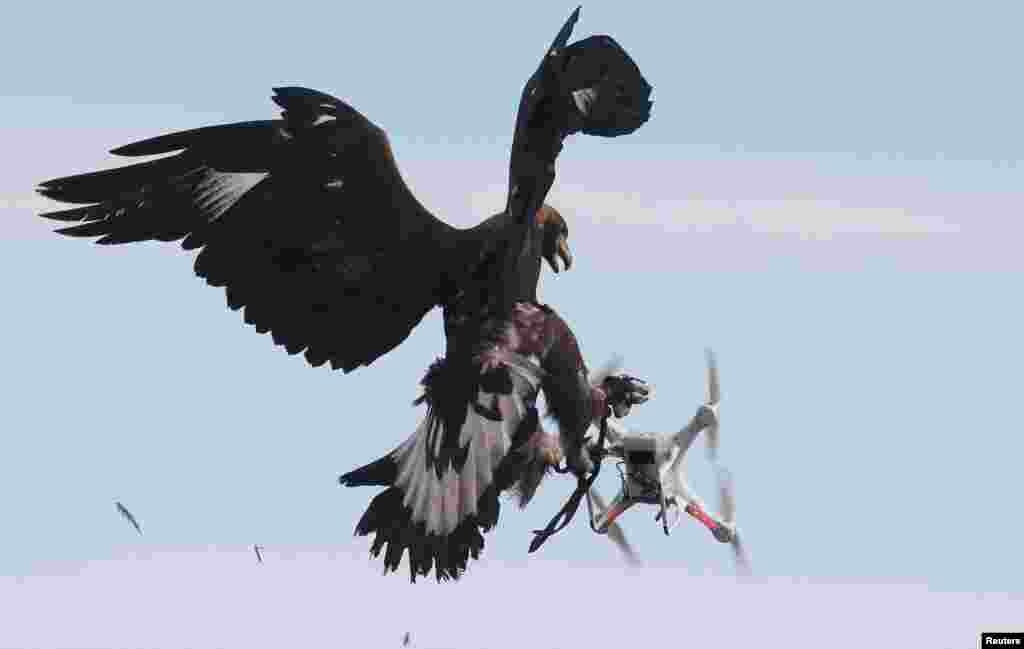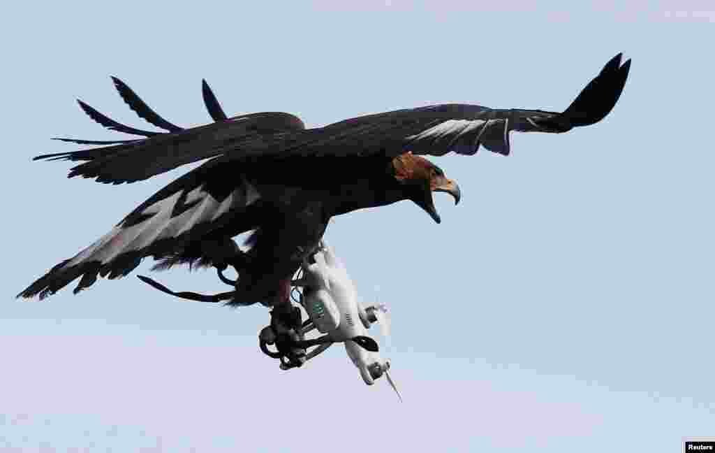 تمرین نظامی در پایگاه نیروی هوایی «مون-د-مارسان» فرانسه؛عقابی پهپادی را شکار می کند. سال گذشته پلیس هلند نیز اعلام کرد که عقاب برای شکار پهپاد تربیت کرده است. استفاده از پهپادها توسط افراد آماتور در اروپا رو به افزایش است و پلیس نگران خطراتی است که این هواپیماها ممکن است در فضاهای عمومی مانند محوطه فرودگاهها داشته باشند.