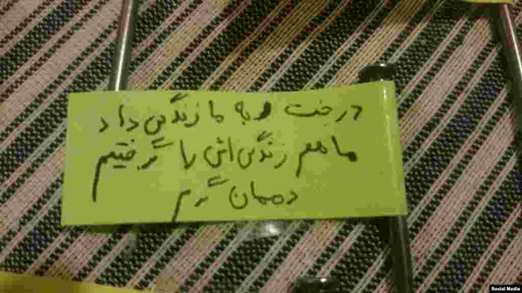 تعدادی از هنرمندان جوان در تهران برای جلوگیری از قطع درختان کهنسال ولیعصر تهران، کمپینی راه انداخته اند به نام "کمپین حمایت از درختان صدساله ولیعصر". آنها در اقدامی نمادین در کنار تنه بریده یکی از درختان چنار ولیعصر مقابل تئاتر شهر، از رهگذران خواسته اند که برای این درختان بریده شده، پیام تسلیتی روی تکه کاغذهای رنگی بنویسند. در آخر پیام تسلیت مردم را بر روی تنه بریده درخت با میخ وصل کرده اند. مقامات شهرداری می گویند اقدام به قطع درختانی می کنند که خشک شده اند و خطر سقوط دارند. آنها علت خشک شدن درختان را وجود موش ها، ریختن زباله توسط مردم و کم آبی و گرم شدن زمین می دادند. در سالهای اخیر اعتراضات بسیاری به قطع درختان چنار خیابان ولیعصر که قدمتی صدساله دارند، از سوی فعالان محیط زیست و هنرمندان صورت گرفته است.