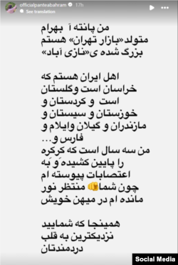خانم بهرام در استوری اینستاگرامش همچنین خود را «متولد "بازار تهران" و بزرگشدهٔ "نازىآباد"» معرفی کرده و افزوده است: «اهل ايران هستم كه خراسان است و گلستان است و كردستان و خوزستان و سيستان و مازندران و گيلان و ايلام و فارس و...»